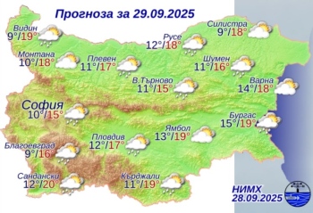 Днес отново ще духа слаб до умерен североизточен вятър, който в западните райони постепенно ще се ориентира от запад-северозапад. Минималните температури ще бъдат между 8° и 13°, за София – около 10°. Максималните температури - между 15° и 20°, за София – около 15°.
