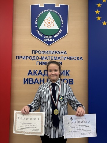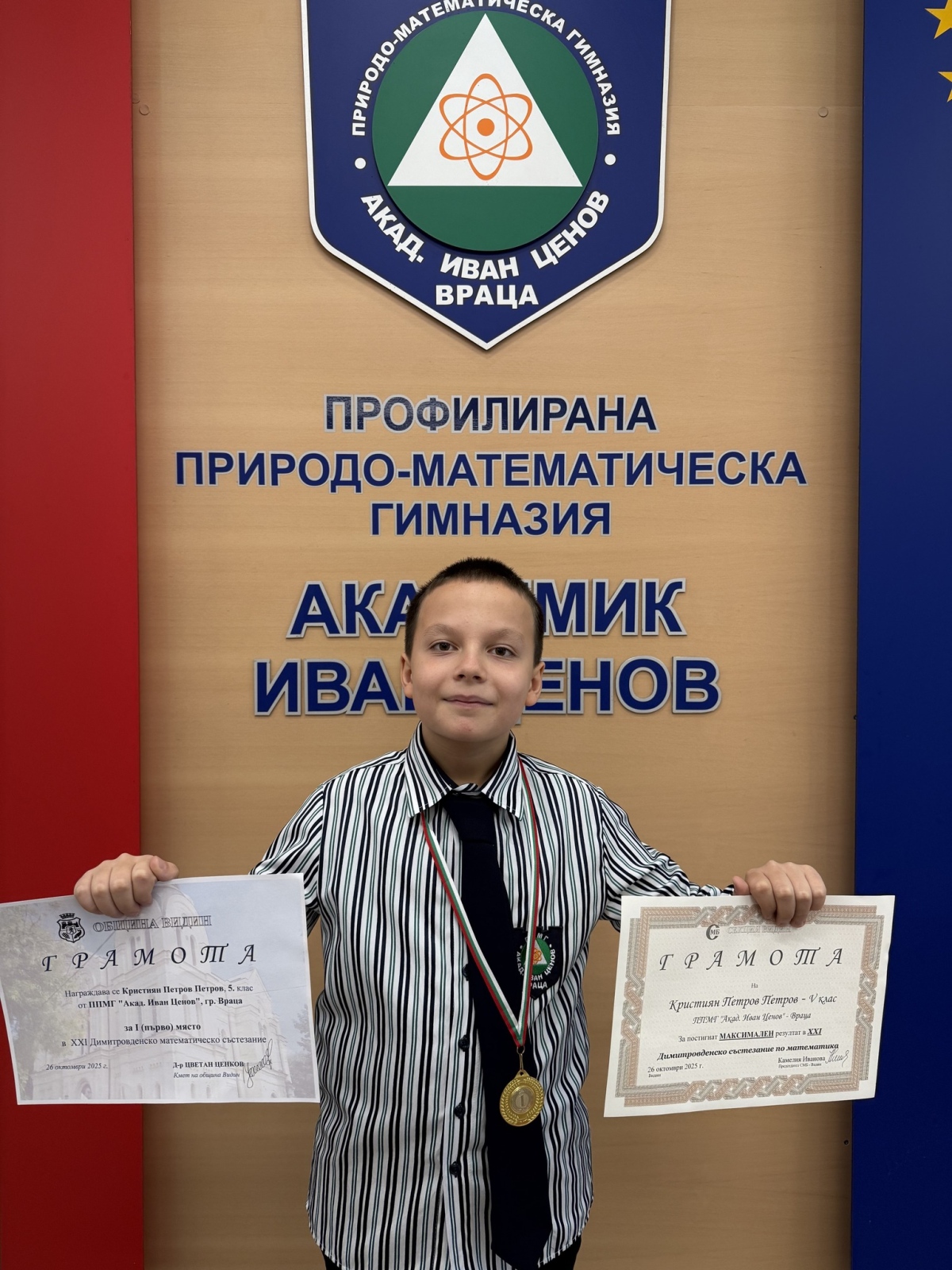 Кристиян Петров и Белла Петрова от V а клас на Профилираната природо-математическа гимназия спечелиха златни медали и грамоти, класирайки се на първо място с максимален брой точки на Димитровденското математическо състезание – 2025 г.