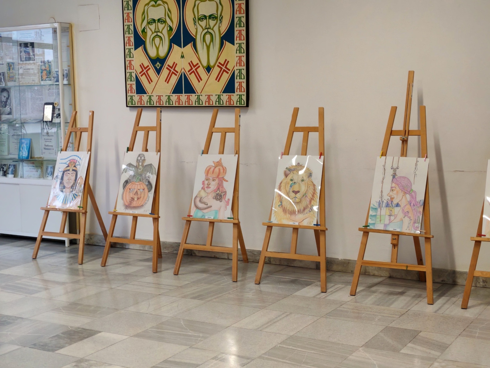 Експозицията включва 20 рисунки, изпълнени с цветни моливи върху картон: „Мухи“, „Национален дворец на културата“, „Мачки“, „Цирк“, „Лъв“, „Кокона“, „Хелоуин“, „Египет“, „Жената с котките“, „Жени“, „Дамата с лисиците“, „Жената с папагалите“, „Котаци“, „Жената с мопсчетата“, „Чаша кафе“, „Морско дъно“, „Есен“, „Море“, „Църквата „Св. София“ в Несебър“ и „Старият Несебър“.