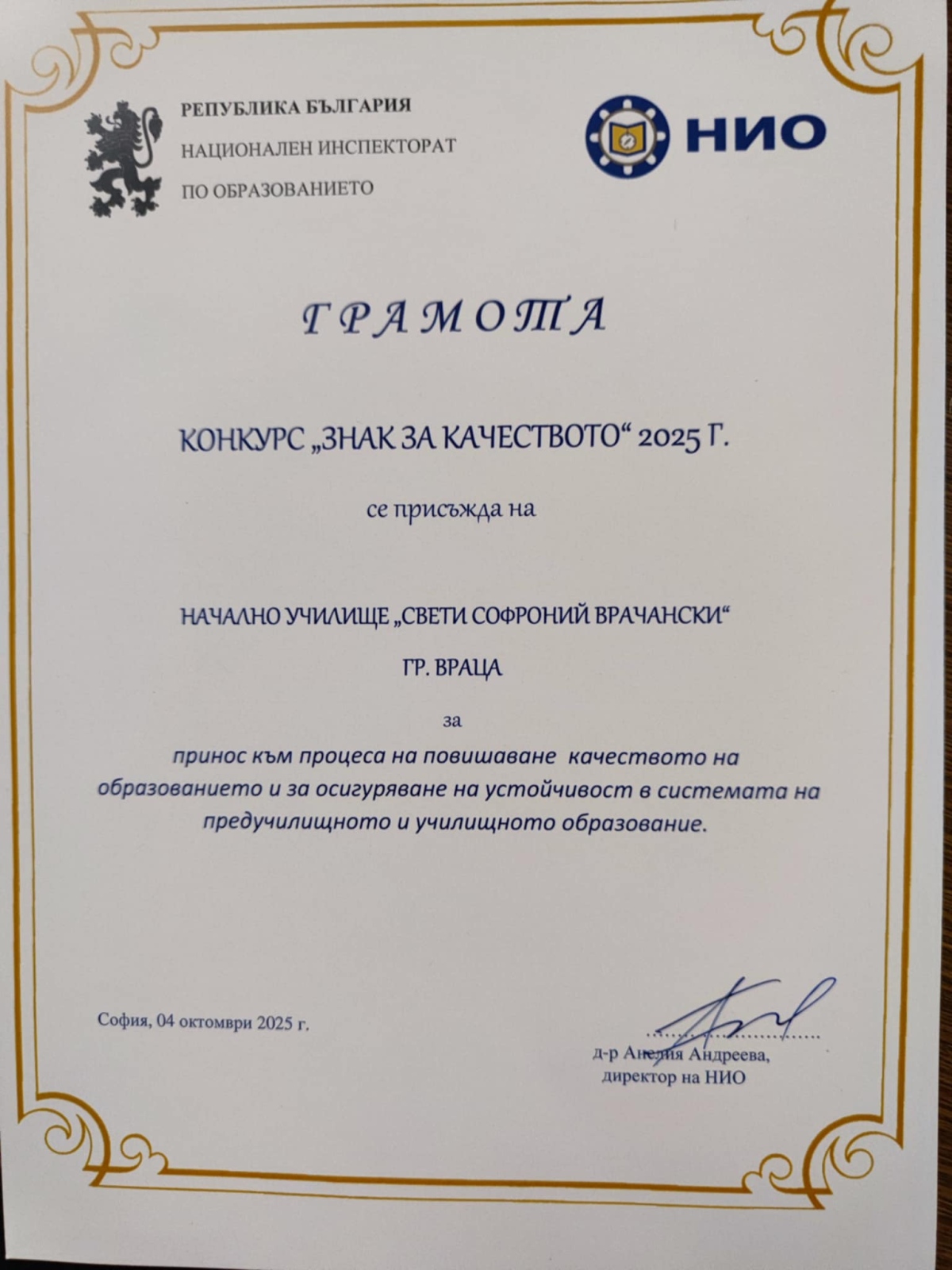 НУ „Св. Софроний Врачански“ - Враца получи високото отличие – грамота „Знак за качество“ 2025 г. от Националния инспекторат по образованието на официална церемония, която се състоя в Министерски съвет. През тази година се проведе Четвъртото издание на конкурса „Знак за качество“ за инспектираните училища през учебната 2024/2025 година. В него участваха 60 училища от страната, получили висока оценка в трите области на инспектиране, като 16 от цяла България получиха номинация за награждаване, а само 6 от тях бяха наградени.