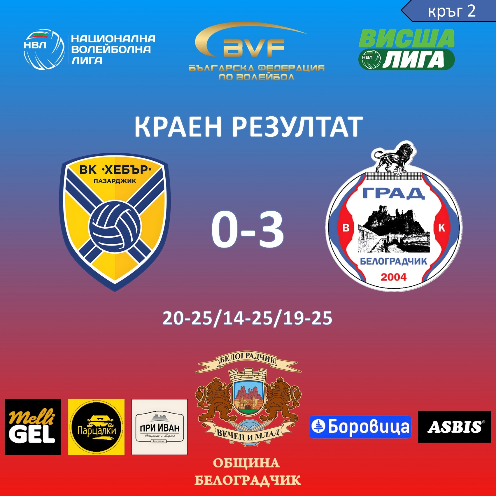В среща от 2-ия кръг момчетата от "Град" Белоградчик надиграха "Хебър" Пазарджик с категоричното 3:0 гейма (20:25; 14:25; 19:25 т.). Мачът се игра в зала "Панайот Пондалов" в София, поради заетост на зала "Васил Левски" в Пазарджик. Заслужените три точки изстреляха "Град" в средата на временното класиране.
