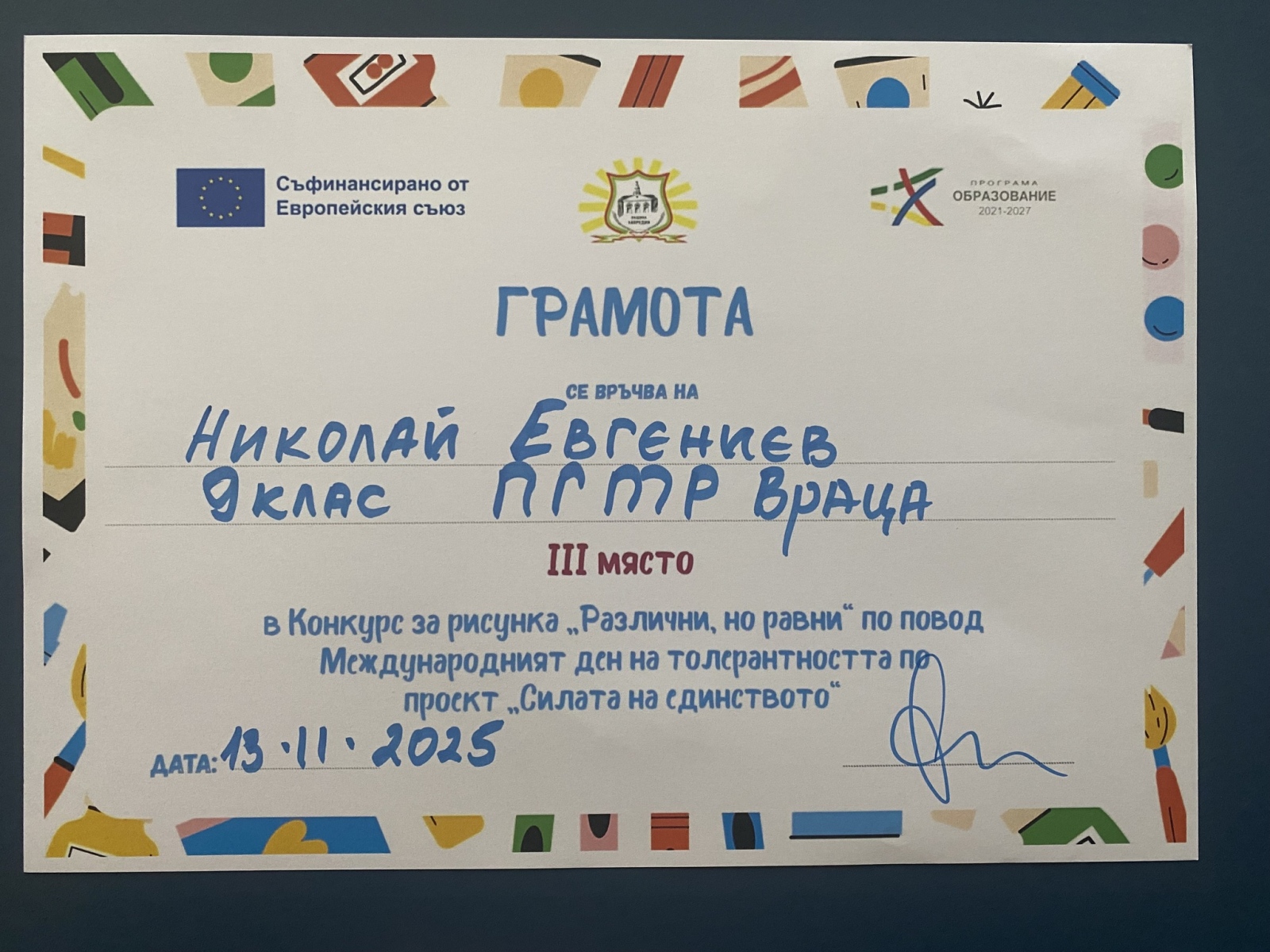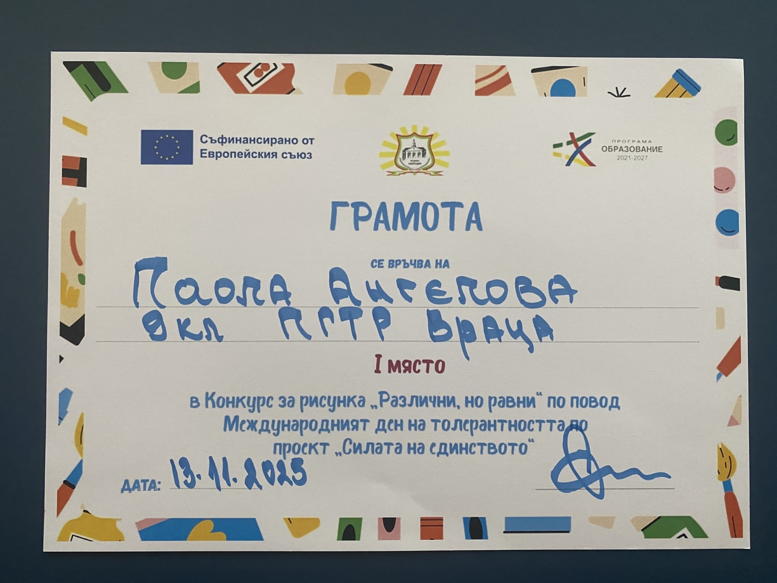 Ученичка от Професионална гимназия по търговия и ресторантьорство – Враца спечели първо място в конкурс за рисунка, организиран от Община Хайредин и сдружение „Нов Път“. Конкурсът се организира в изпълнение на Дейност 4 Провеждане на информационни кампании, насочени към недопускане на дискриминация, основана на раса, етнически произход или религиозна принадлежност по Проект № BG05SFPR001-1.004-0048-C01 „Силата на единството“, финансиран от програма „Образование“ 2021-2027. Участници в конкурса бяха СУ „Васил Воденичарски“ – с. Хайредин, Професионална гимназия по търговия и ресторантьорство – гр. Враца и ОУ „Горан Червеняшки“ – с. Михайлово, а целта му е да насърчи децата и младежите да изразят чрез изкуство своето виждане за толерантността, уважението към различията и равенството между хората. Инициативата е посветена на отбелязването на Международния ден на толерантността – 16 ноември, който се провежда ежегодно и е свързан с насърчаването на уважение, приемане и разбиране между хората, независимо от техните култури, вярвания или лични особености. Паола Ангелова спечели първо място, а Николай Евгениев – трето. И двамата ученици са от IXв клас на ПГТР – Враца и участваха в III група на конкурса: 8 – 12 клас. Почетни грамоти за участие получиха Цветелина Бориславова от XIIв клас, Мария Начова от IХа клас, Сиана Георгиева и Ивана Недялкова от IХв и Тея Аврамова от VIIIа клас.