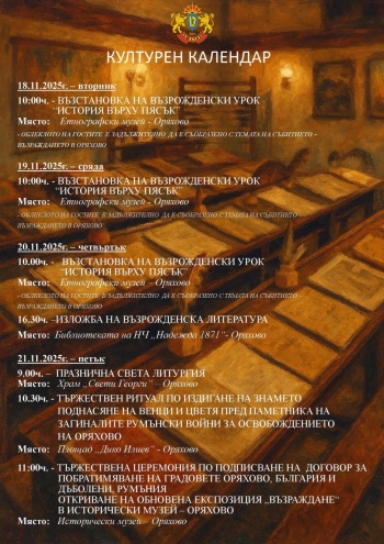 На 18, 19 и 20 ноември от 10 часа в Етнографски музей – Оряхово ще се проведат възстановки на възрожденски урок „История върху пясъка“. Желаещите, които ще присъстват трябва да бъдат облечени подходящо за събитието във възрожденско облекло.