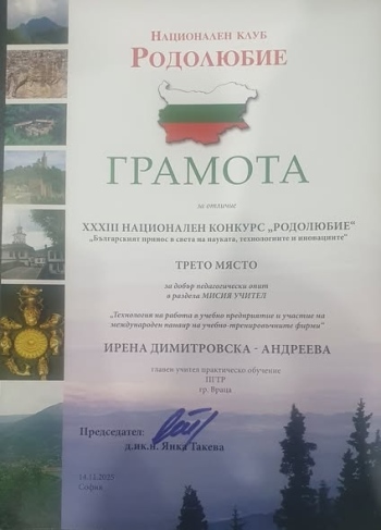 В музей „Земята и хората“ в София се проведе заключителния етап на Националния конкурс „Родолюбие“, организиран от Национален клуб „Родолюбие“ под наслов „Българският принос в света на науката, технологиите и иновациите“. Главнят учител в Професионална гимназия по търговия и ресторантьорство – Враца, Ирена Димитровска-Андреева, беше класирана на трето място в раздел „Мисия учител“ с разработка на тема: „Технология на работа в учебно предприятие и участие на международен панаир на учебно-тренировъчни фирми“. Специален гост на заключителния етап на конкурса беше зам.-министъра на образованието Наталия Михалевска. Конкурсът се организира с подкрепата на Синдиката на българските учители и Министерство на образованието и науката.