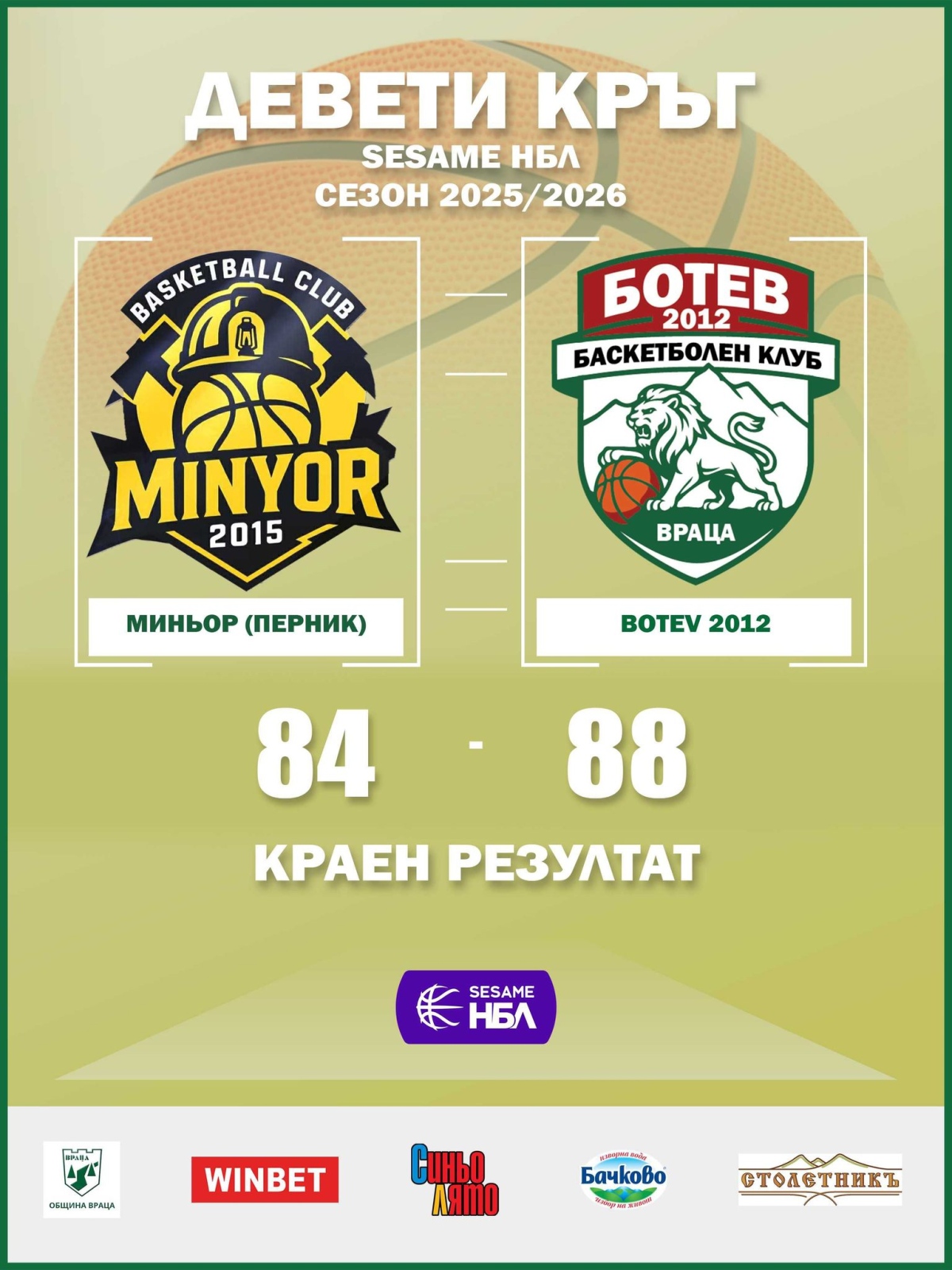 Продължават успешните изяви на младия тим на Ботев 2012 Враца. Воденият от Йован Попович и от помощника му Мирослав Ралчев спечелиха визитата си на Миньор Перник с 88-84 (17-16, 18-13, 25-29, 28-26) в мач от 9-и кръг на мъжкото ни първенство по баскетбол.