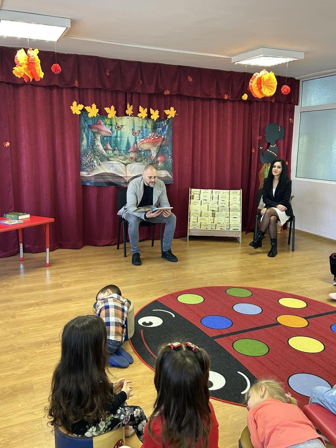 Г-н Кръстев прочете избрана приказка на децата, успявайки да привлече вниманието им и да събуди тяхното въображение. В знак на благодарност малчуганите представиха кратка програма: рецитираха стихотворение, посветено на книгата, изпълниха драматизация на любима приказка и завършиха с песен.