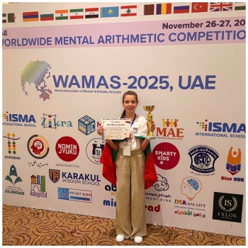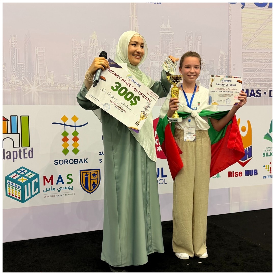 От училището с гордост съобщиха, че седмокласничката Ния Георгиева Шкетиева от ППМГ „Акад. Иван Ценов“ - Враца, постигна забележителен успех на Световното първенство по ментална аритметика WAMAS 2025. Състезанието се проведе в края на месец ноември в Дубай, Обединени Арабски Емирства. Представяйки България и Smarty Kids – Враца, Ния победи стотици участници от множество държави и спечели престижната титла СУПЕРШАМПИОН WAMAS 2025.