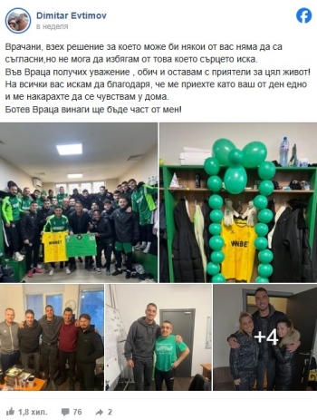 Ботев Враца винаги ще бъде част от мен!", гласи постът на Евтимов в социалните мрежи.