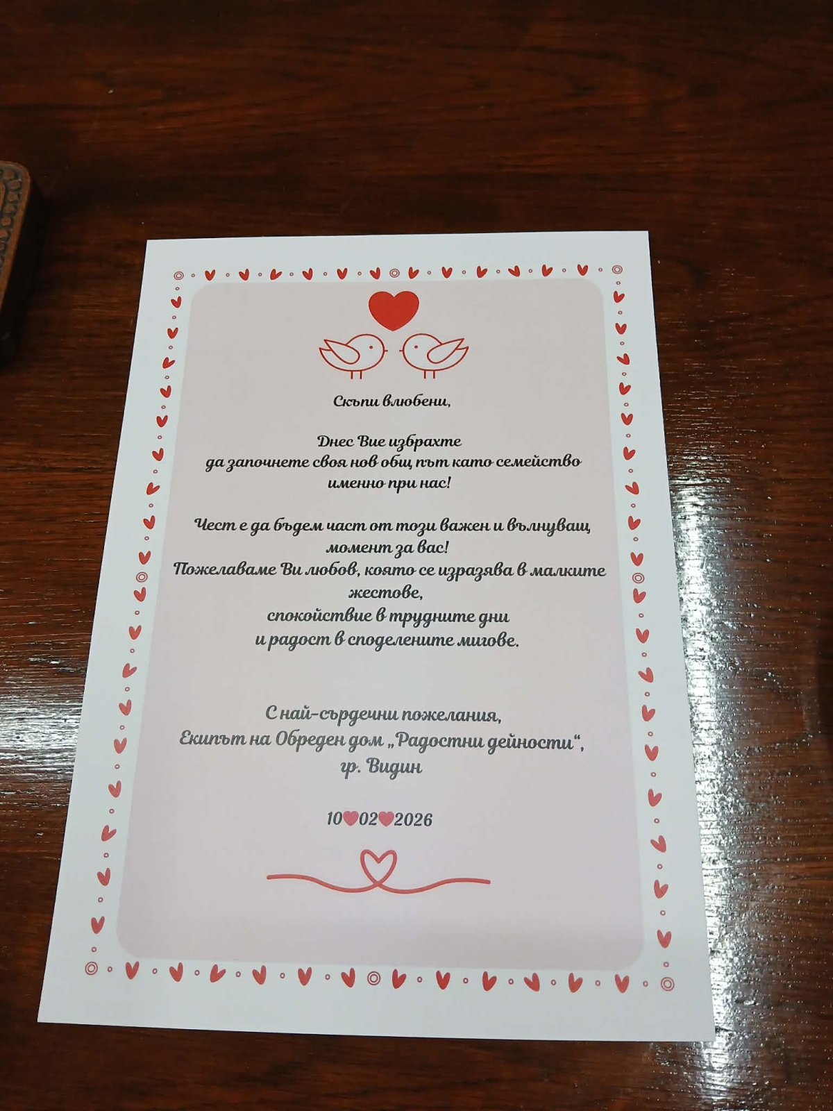 „Любовта е в основата на семейството, а семейството е в основата на едно здраво общество. Бракът е не само един незабравим момент от живота, но и отговорност, градеж, стабилност и проверка на времето“, заяви Велкова. Тя съобщи, че от началото на 2026 година досега в община Видин са сключени 11 брака.