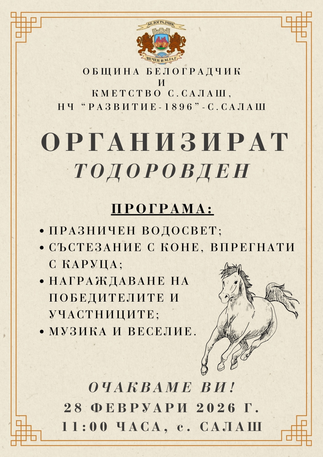 Община Белоградчик и кметство с. Салаш, НЧ "Развитие-1896"- с. Салаш организират Тодоровден на 28 февруари от 11 часа, който традиционно ще се проведе в с. Салаш. Програмата ще започне с празничен водосвет, след което състезание с коне, впрегнати с каруца. Най-бързите ще получат награди и специални грамоти. Празникът ще продължи с музика и веселие. Община Белоградчик осигурява превоз за гражданите желаещи да присъстват на Тодоровден.