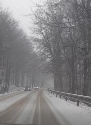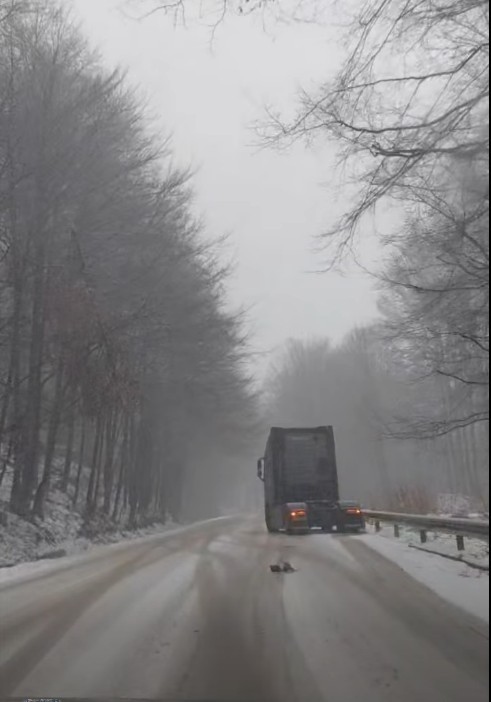 Видимостта е намалена, а по кадрите личи, че пътната настилка на места е покрита със снежна покривка.