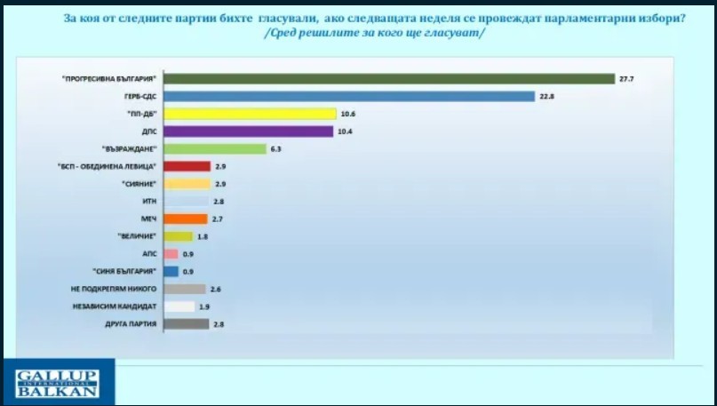 Данните сочат, че първа политическа сила с отчетлива преднина сред решилите за кого ще гласуват е „Прогресивна България“ - 27,7%. В сравнение с регистрираните 29,8% в проучването от февруари, се забелязва известен спад, но това все още не дава основания да се смята, че е налице устойчива тенденция. По-скоро се проявява волатилността в електоралния ръст на тази формация, върху която влияе тяхната вяла предизборна кампания досега и късното обявяване на наименованието на коалицията.