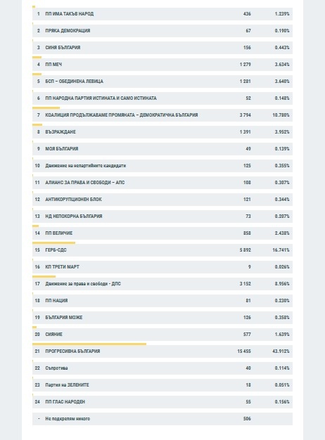 3794 души вчера са гласували за ПП-ДБ и това подрежда коалицията на трето място с 10,780 процента. ПП-ДБ са намалили резултата си спрямо 2024 година с 2 процента.