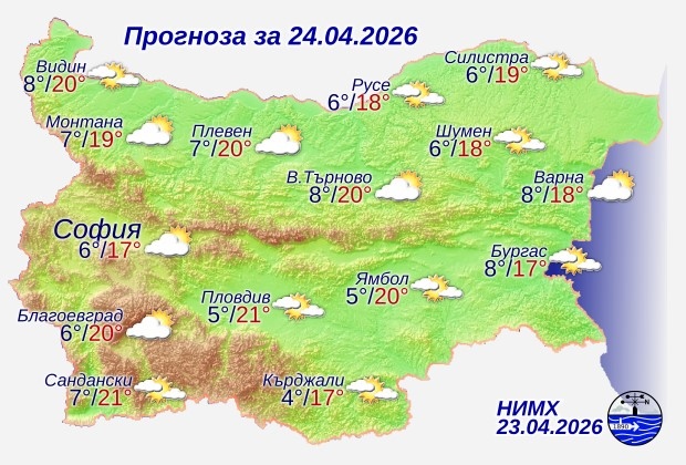 Облачността ще е променлива, преди обяд - често намаляваща до предимно слънчево време. Минималните температури ще са между 4° и 9°, а максималните - между 16° и 21°. В София минималната температура ще е около 6°, максималната - около 17°.