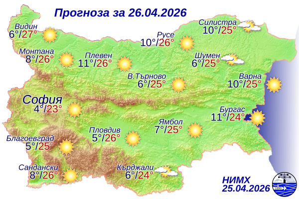 Днес ще бъде слънчево. Вятърът ще се ориентира от запад-северозапад, вечерта в Североизточна България от север-североизток, в Северна България ще се усили и ще бъде умерен и силен. Максималните температури ще бъдат между 23° и 28°, в София - около 23°. През нощта срещу понеделник през страната ще премине размит студен атмосферен фронт. Ще има временни увеличения на облачността. Вятърът ще се ориентира от север-североизток, в Източна България умерен и силен и с него в страната ще нахлува студен въздух.