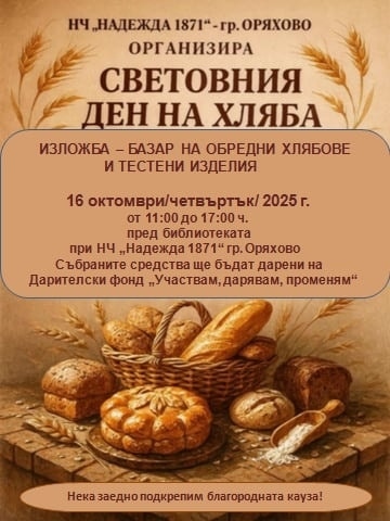 По повод Световния ден на хляба в Оряхово ще се проведе благотворителна Изложба - базар на обредни хлябове и тестени изделия. Инициативата се организира от НЧ "Надежда 1878" Оряхово. Събитието ще се проведе на 16 откомври, от 11:00 до 17:00 часа пред Библиотеката на Читалището. Събраните средства ще бъдат дарени на Дарителски фонд "Участвам, дарявам, променям".