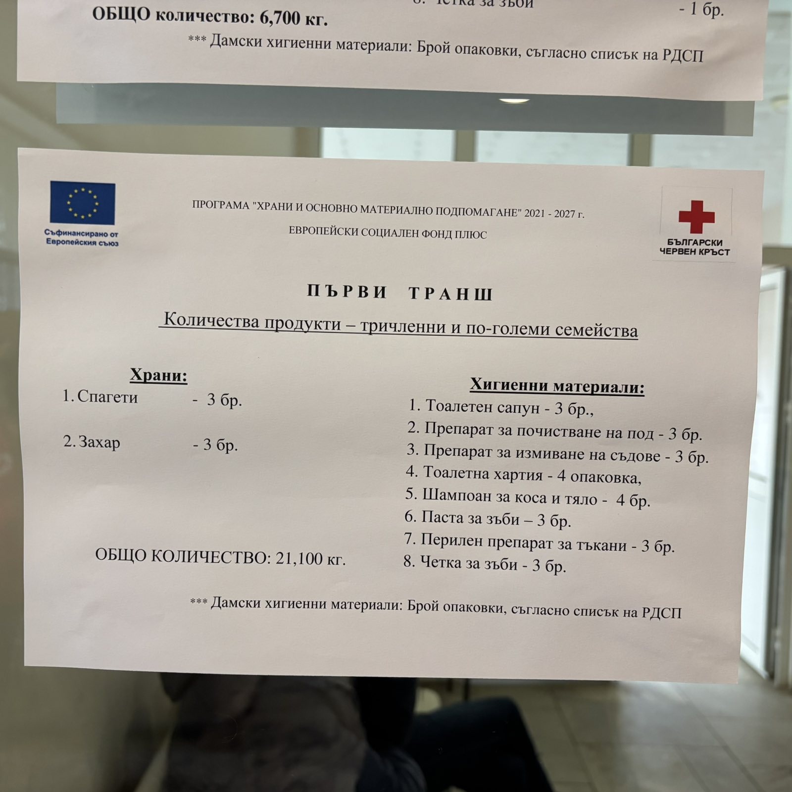 В първия транш помощи има основно хигиенни материали и само два вида хранителни продукти - захар и спагети. Вторият транш ще съдържа само храни – 15 вида.