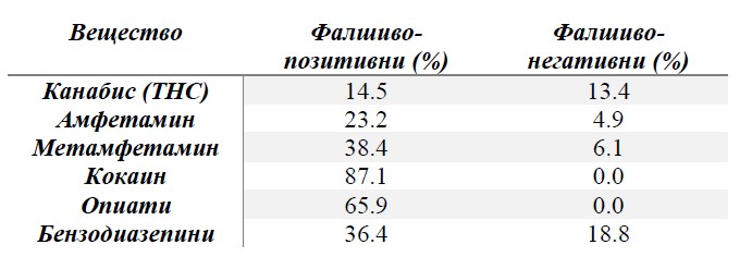 Таблица обобщаваща резултатите от проучването “Evaluation of Dräger DrugTest 5000 in a Naturalistic Setting” (Gjerde et al., Journal of Analytical Toxicology, 2018):