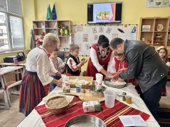 Учениците от II „а“ клас с много настроение представиха песнички и стихотворения, посветени на хляба, и демонстрираха как се замесва хлябът.