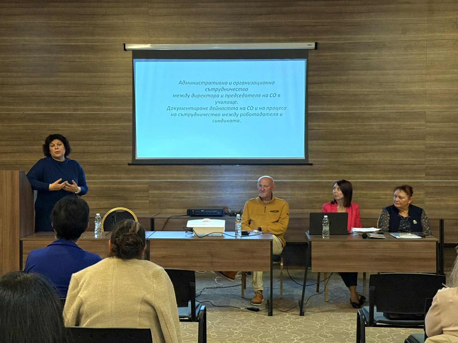 Павлина Петрова – главен експерт-юрист в Централата на СБУ проведе Обучителна сесия на тема: „Административно и организационно сътрудничество между директора и председателя на синдикалната организация в образователната институция“ и отговори на множеството поставени въпроси и казуси, възникващи в работата на синдикалните ръководства.