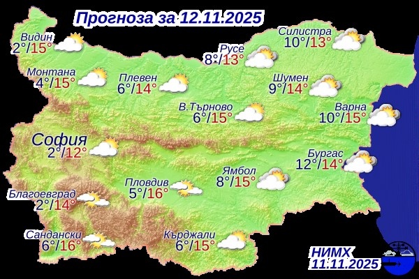 Днес ще преобладава слънчево време, с разкъсана висока облачност. Преди обяд над Източна България облачността ще е все още значителна, но ще се разкъсва и ще намалява. Ще духа слаб, в Дунавската равнина до умерен вятър от запад-северозапад. Максималните температури ще бъдат между 12° и 17°, в София – около 12°.