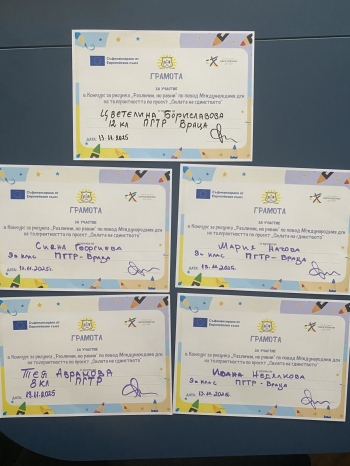 Ученичка от Професионална гимназия по търговия и ресторантьорство – Враца спечели първо място в конкурс за рисунка, организиран от Община Хайредин и сдружение „Нов Път“. Конкурсът се организира в изпълнение на Дейност 4 Провеждане на информационни кампании, насочени към недопускане на дискриминация, основана на раса, етнически произход или религиозна принадлежност по Проект № BG05SFPR001-1.004-0048-C01 „Силата на единството“, финансиран от програма „Образование“ 2021-2027. Участници в конкурса бяха СУ „Васил Воденичарски“ – с. Хайредин, Професионална гимназия по търговия и ресторантьорство – гр. Враца и ОУ „Горан Червеняшки“ – с. Михайлово, а целта му е да насърчи децата и младежите да изразят чрез изкуство своето виждане за толерантността, уважението към различията и равенството между хората. Инициативата е посветена на отбелязването на Международния ден на толерантността – 16 ноември, който се провежда ежегодно и е свързан с насърчаването на уважение, приемане и разбиране между хората, независимо от техните култури, вярвания или лични особености. Паола Ангелова спечели първо място, а Николай Евгениев – трето. И двамата ученици са от IXв клас на ПГТР – Враца и участваха в III група на конкурса: 8 – 12 клас. Почетни грамоти за участие получиха Цветелина Бориславова от XIIв клас, Мария Начова от IХа клас, Сиана Георгиева и Ивана Недялкова от IХв и Тея Аврамова от VIIIа клас.