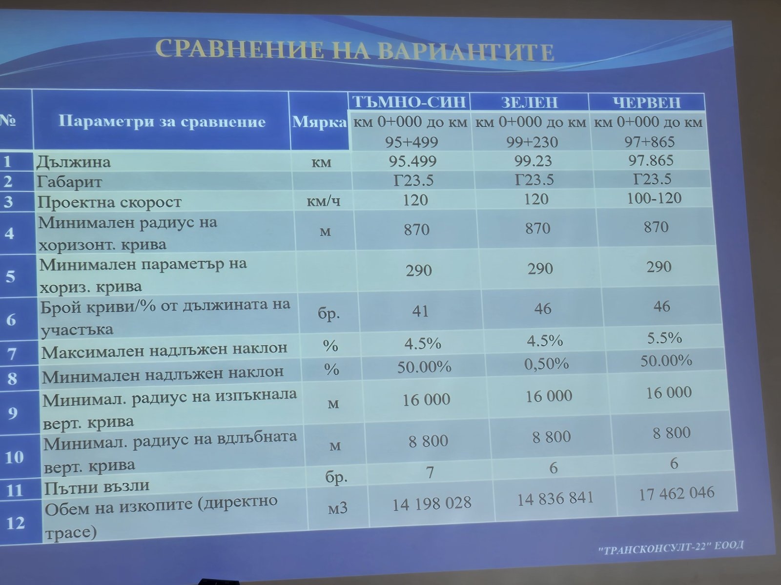"И трите предложения, които е дала фирмата са с път с габарит Г23, което означава, че ще има по две ленти в посока с разстояние 3,5 м по средата, както и лента за бавнодвижещи се автомобили, която е около 30 %. Дължината е до 99 км, защото връзката на този път се свързва с новоизграждащата се магистрала Видин-Монтана. За нас е важно, че всеки един от предложените варианти включват път с габарит Г23, ще има две тръби на тунела, които включват определени изисквания за безопасност, предвидено е места за пресичане на пешеходци, а при авария ще е възможно преминаване в съседната тръба", обясни Емил Трифонов.