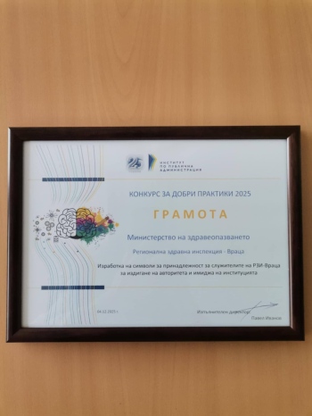 РЗИ-Враца беше удостоена и с грамота от националния конкурс за „Добри практики в дейността на администрацията в България“, организиран от Института по публична администрация. Отличието беше присъдено на здравната инспекция за изготвеното предложение, по повод реализирана добра практика - „Изработка на символи за принадлежност за служителите на РЗИ-Враца за издигане на авторитета и имиджа на институцията“. През 2025 г. бяха изработени символи за принадлежност – шалчета за служителките, значки, визитки и почетни грамоти за най-дългогодишните служители на инспекцията, за последващото им използване, с цел изграждането на по-силен и разпознаваем публичен образ на институцията, за утвърждаване на нейните ценности, укрепване на организационната и екипна култура и повишаване на гордостта на служителите.
