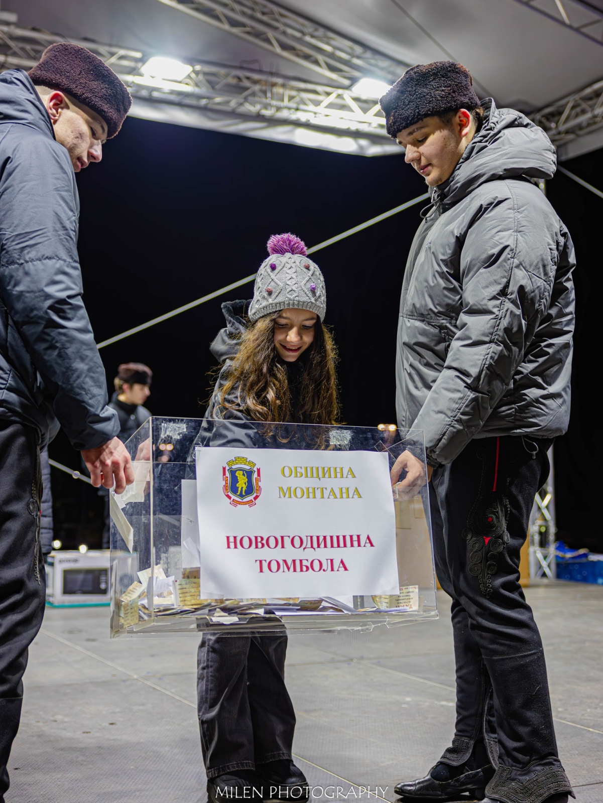 Част от новогодишното тържество беше и традиционната томбола на Община Монтана. Голямата награда – 50-инчов смарт телевизор – спечели малкият Виктор, който участва и в тегленето на печелившите талони. Сред наградите бяха още фотопринтер, мултикукър, кафе машина и други полезни предмети за домакинството.