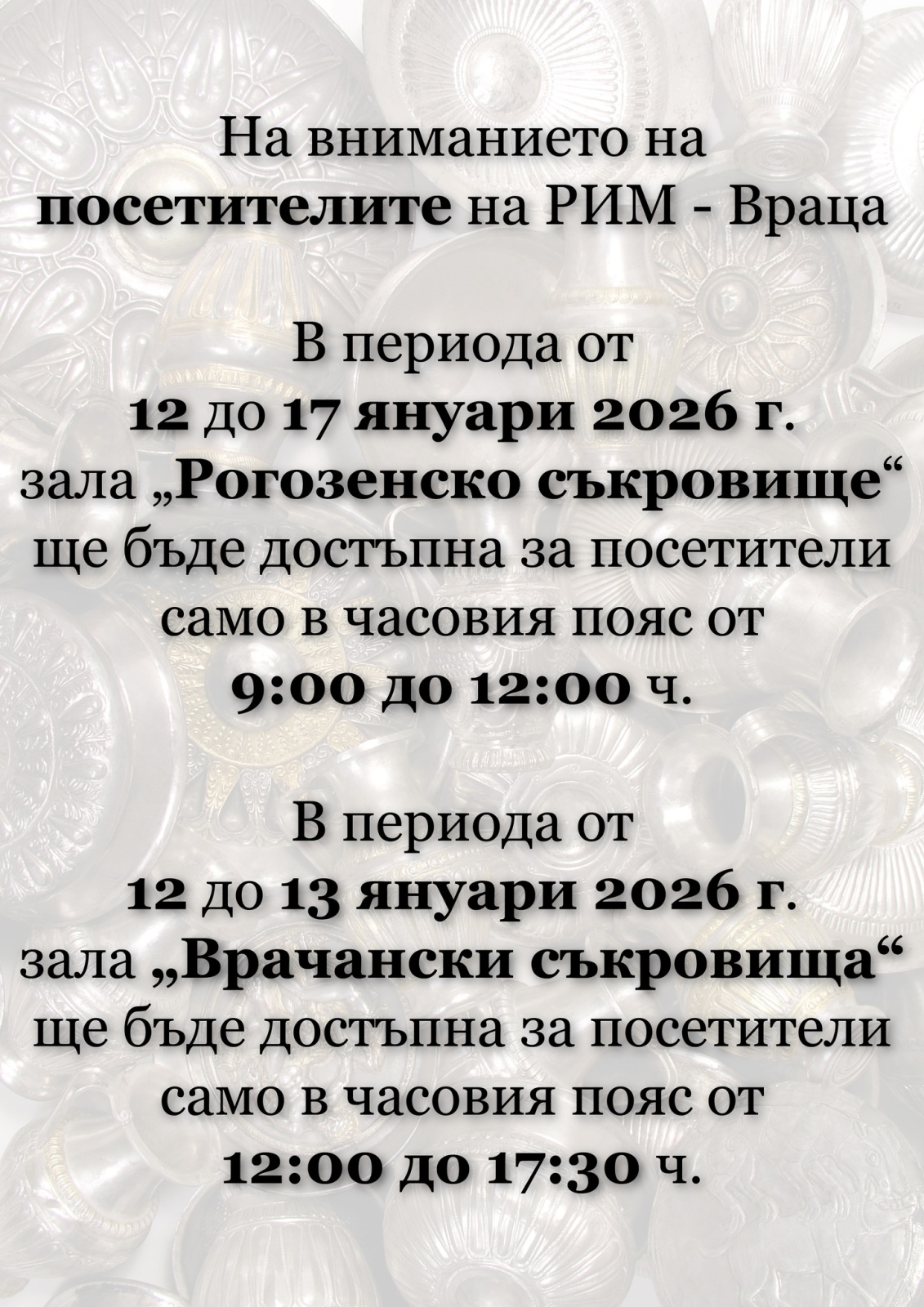 В периода от 12 до 17 януари зала „Рогозенско съкровище“ ще бъде достъпна за посетители само от 9 до 12 часа.