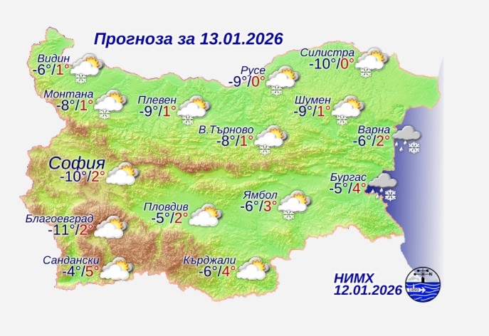 Днес от запад облачността ще се увеличи. През втората половина на деня и през нощта срещу сряда на места, главно в северните райони и планините, ще превали слаб сняг. Ще духа слаб, в източните райони до умерен вятър от запад-югозапад. Максималните температури ще бъдат предимно между 0° и 5°, за София - около 2°.