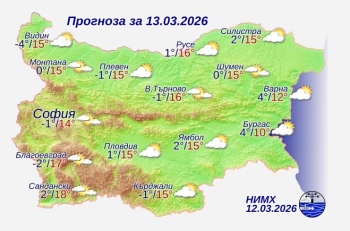 Днес ще бъде предимно слънчево. На места в равнинната част от страната ще е мъгливо или с ниска облачност, но в следобедните часове в повечето райони мъглите ще се разсеят, а облачността ще се разкъса. Ще духа слаб до умерен вятър от изток-североизток. Максималните температури ще бъдат между 13° и 18°, по-ниски по Черноморието – между 8° и 12°, в София – около 14°.