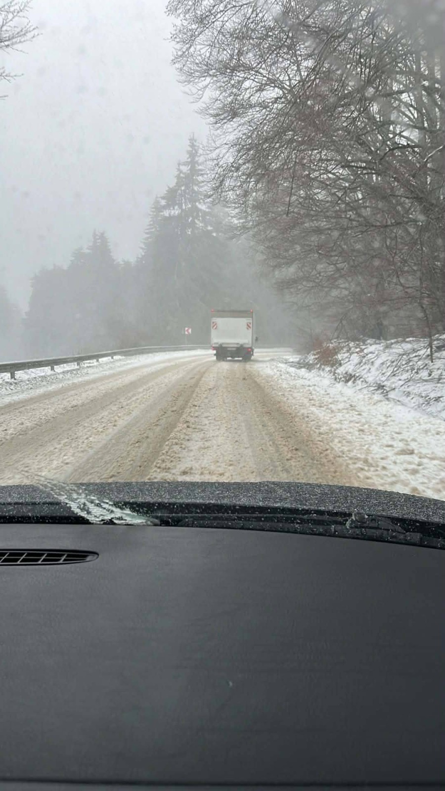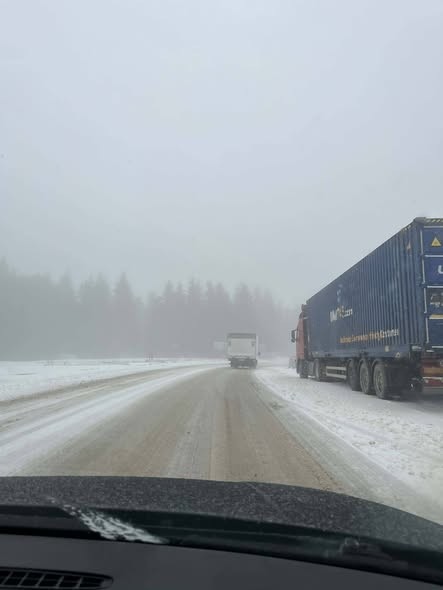 Пътуващи през "Петрохан" шофьори споделят в социалните мрежи, че на Прохода има сняг и мъгла, температурата на върха е -1°, а както е видно от снимките и ТИР-ове.