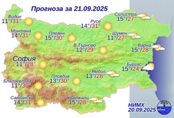 Днес ще бъде слънчево, но преди обяд над Източна България ще има ниска облачност. Ще духа слаб до умерен източен вятър. Максималните температури ще бъдат между 26° и 31°, в София - около 28°.
