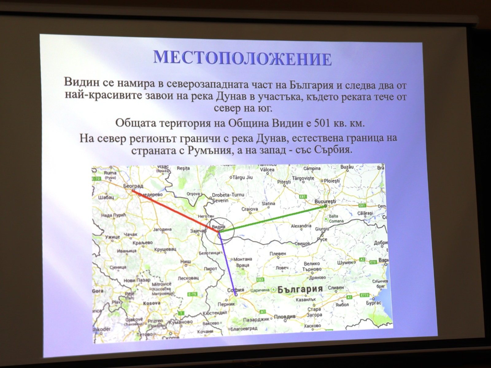 Пред китайските гости бяха представени 6 презентации. Заместник-кметът Десислава Тодорова представи община Видин в демографски, икономически, социален, физикогеографски и културно-исторически аспект. Индустриална зона Видин юг бе представена на потенциалните инвеститори от нейния изпълнителен директор Цветомира Илиева. Архитектурно студио „Амфион” представи идеен проект на високотехнологичен (Hi-Tech) парк на територията на бившето военно поделение край крепостта „Баба Вида”. Представени бяха и две фирми – с изцяло изградена и готова за експлоатация материална база и за преработка на нефтопродукти. Компанията „Балкански индустриален парк”, представлявана от един от предходните министър-председатели на България – Жан Виденов представи проекта си за Индустриален парк „Дунав” край Видин.