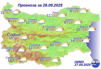 И през следващото денонощие облачността над страната ще се задържи значителна. Около и след полунощ на места в западните райони ще има превалявания от дъжд, които с временни прекъсвания ще са характерни и за дневните часове. През нощта срещу понеделник преваляванията ще обхващат и централните райони от страната. Вятърът в повечето места ще отслабне. В Източна България ще бъде умерен: през нощта - от север, а утре – от изток-североизток. Минималните температури ще бъдат между 8° и 13°, за София – около 10°, максималните - между 15° и 20°, за София – около 15°.