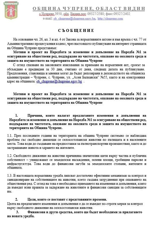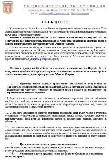 Проектът на промените вече е публикуван на сайта на Община Чупрене. Всеки може да изпрати мнение или предложение в срок от 30 дни на имейл: [email protected] или в деловодството на общината.
