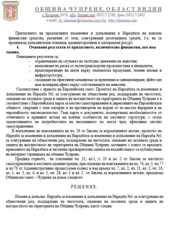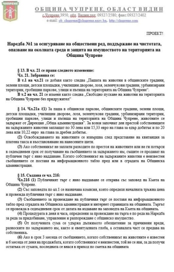 От общината са взели този проблем много сериозно и са предприели действия. Подготвени са промени в Наредба №1 за осигуряване на обществения ред, поддържане на чистотата, опазване на околната среда и защита на имуществото на територията на Община Чупрене, с които се въвеждат по-ясни правила и по-строги мерки срещу нарушителите.