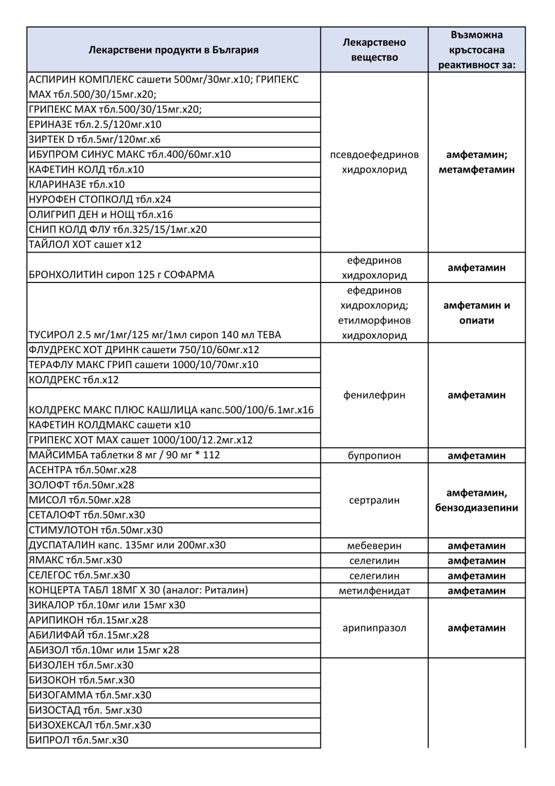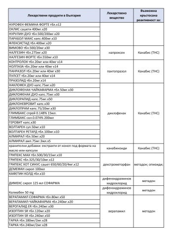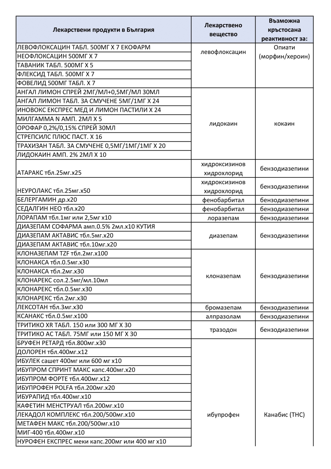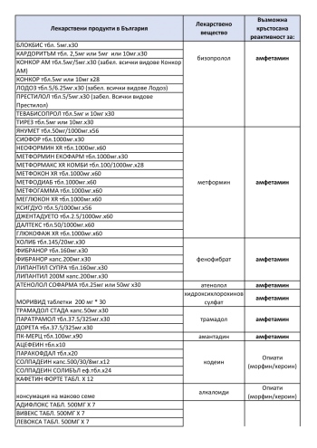 На база научни проучвания (погледни: „Източници на информация“), ФАРМАКОЗНАНИЕ.БГ предоставя обобщителна таблица на лекарства, които е възможно да предизвикат фалшив положителен резултат при тестване с Dräger DrugTest 5000 или с класически имунохроматографски тестове закупени от аптеката.