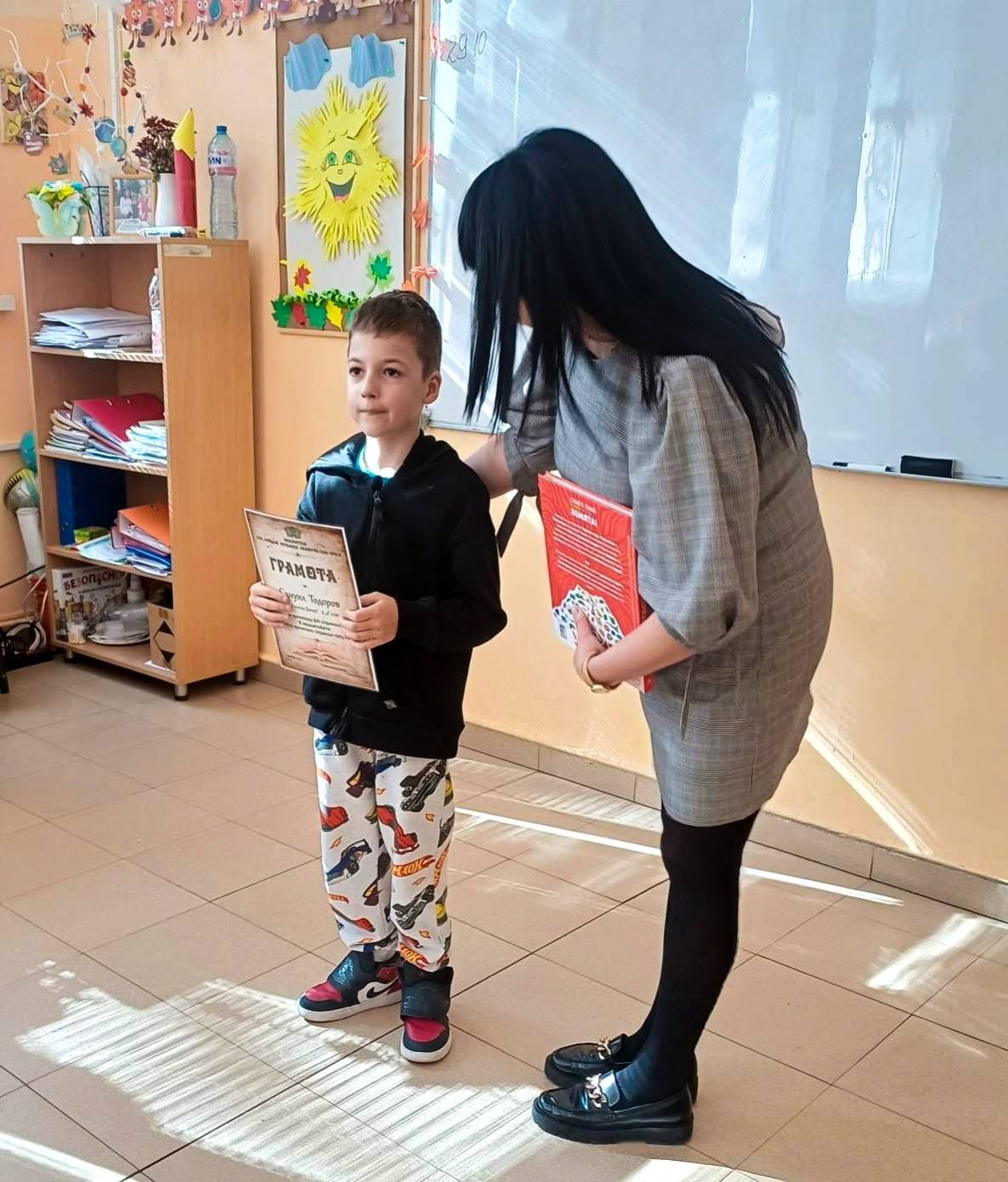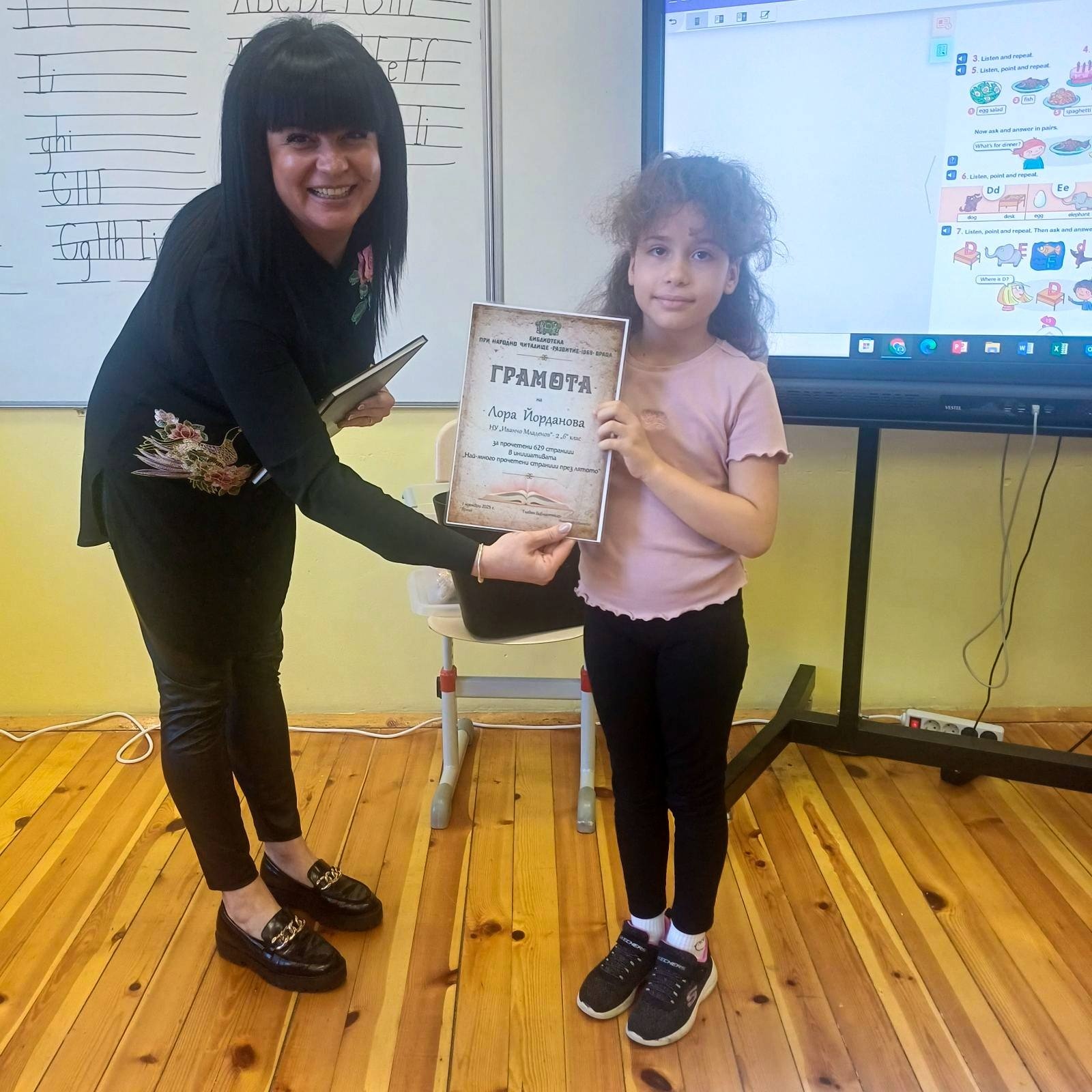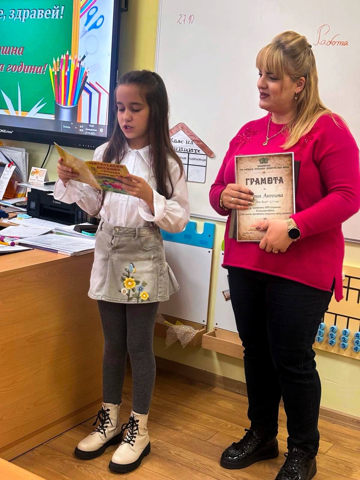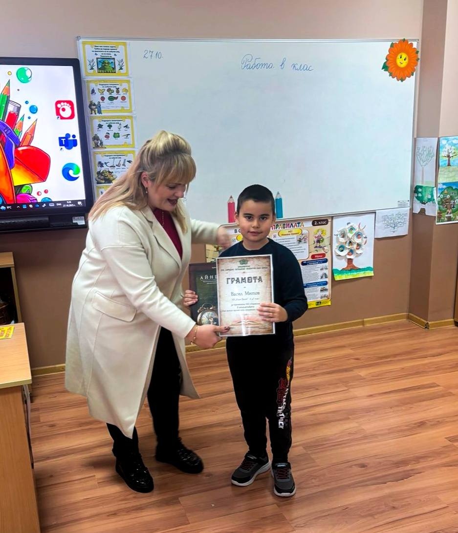 Библиотекарите Дона и Рали посетиха отличените деца в училище, за да ги поздравят, да им връчат грамоти и любими заглавия за четене извън задължителния списък. Те отправиха вдъхновяващи послания във всеки посетен клас, а гордо изправеният пред всички читател бе пример за наш малък будител.