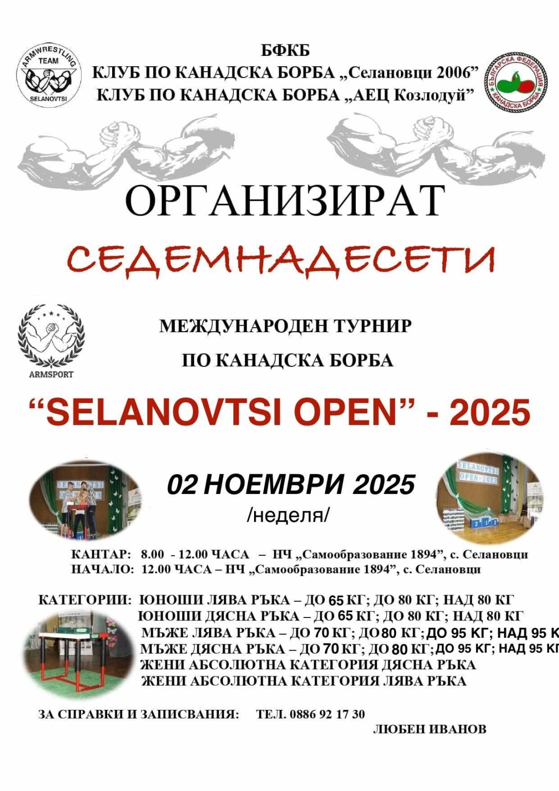 Международен турнир по кандска борба ще се проведе тази неделя, 2 ноември, в Селановци. Местният спортен клуб "Селановци 2006" е домакин и организатор на надпреварата.