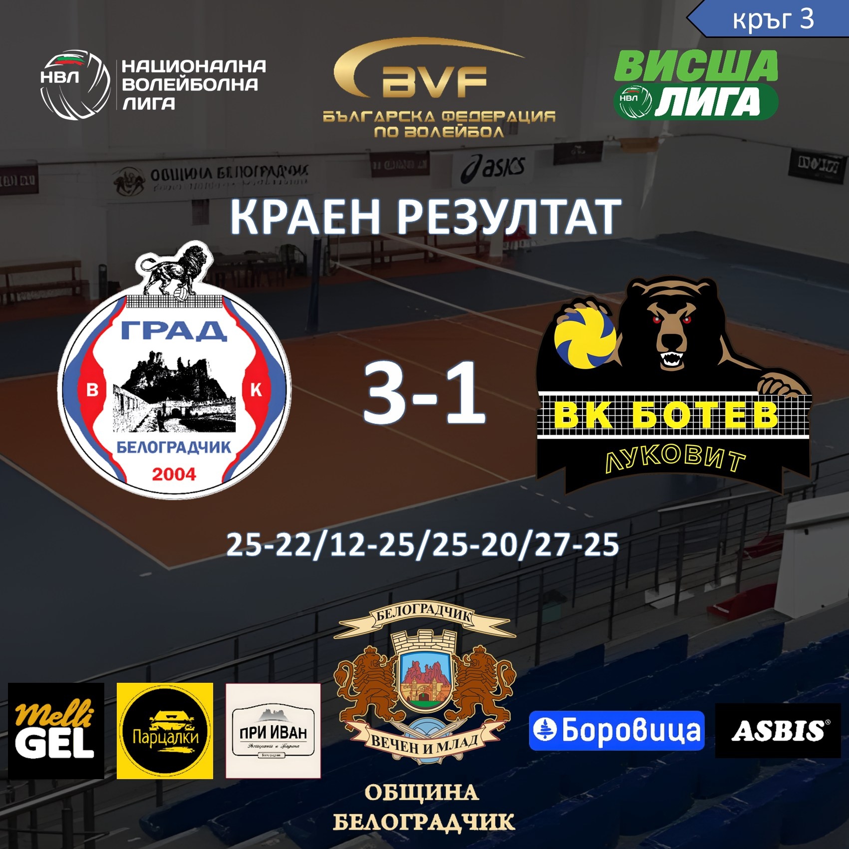 В среща от 3 кръг на НВЛ Висша лига Волейболен клуб "Град" Белоградчик надиграха трудно коравият отбор на Ботев (Луковит) с 3-1 гейма. По този начин прекъснаха негативна серия от последователни домакински загуби, която датира от близо една календарна година.