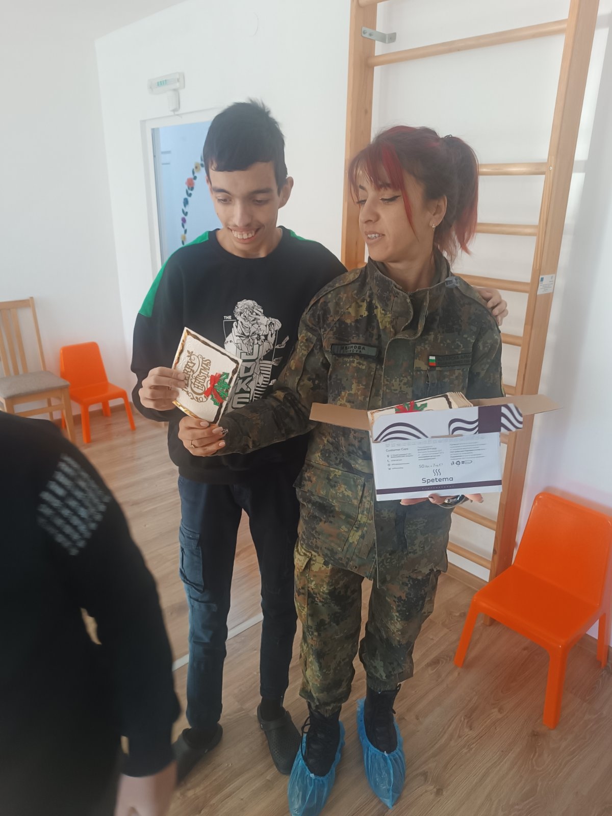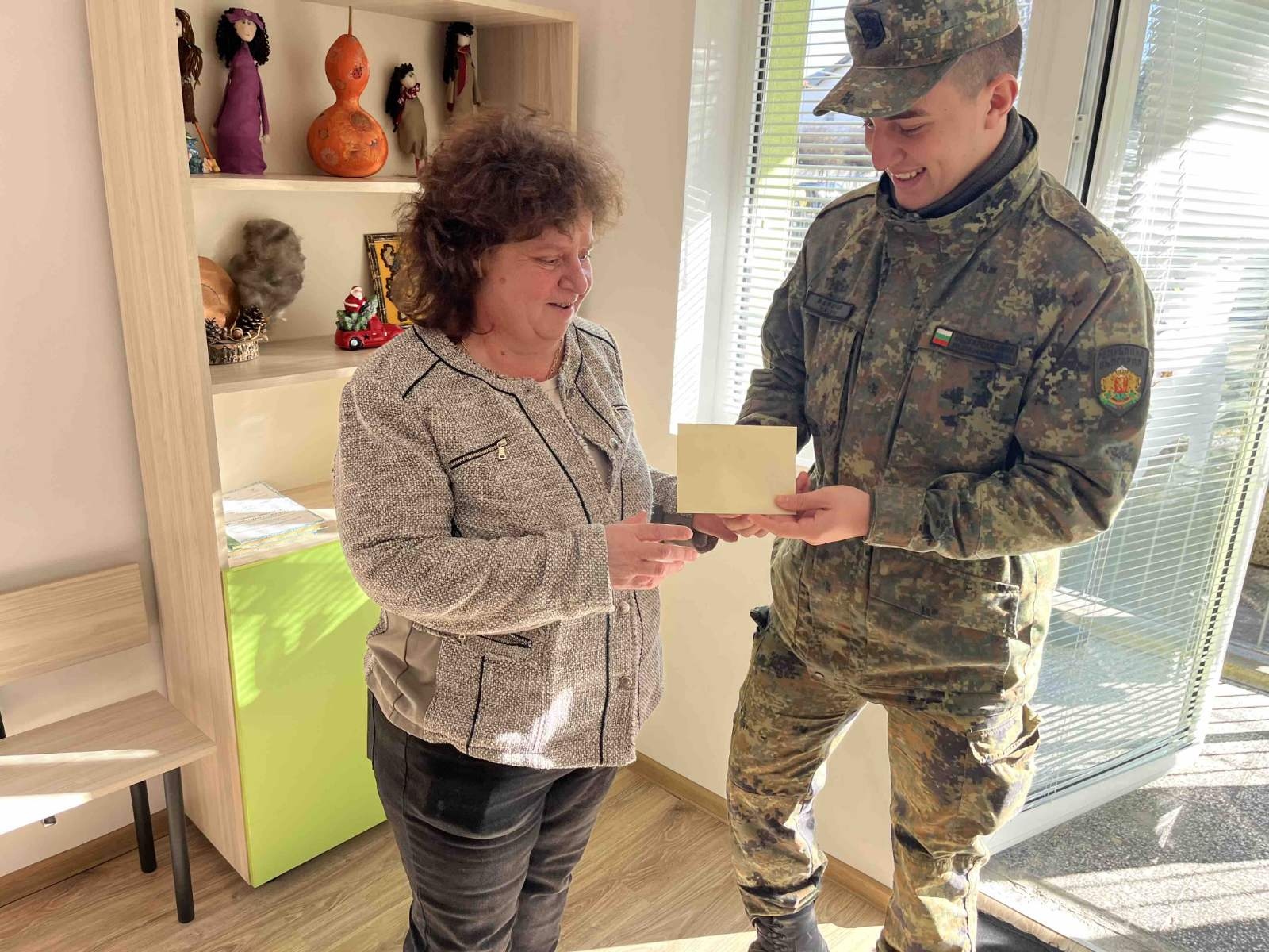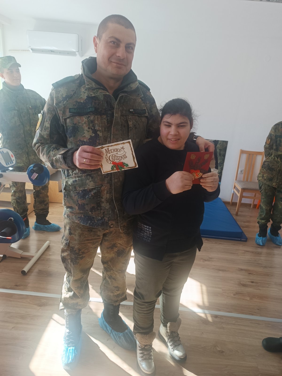 В знак на признателност и благодарност за оказаната подкрепа, потребителите и екипът на Центъра поднесоха на военнослужещите ръчно изработена коледна картичка – символ на топлото отношение и взаимната подкрепа.