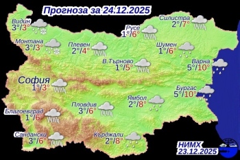 Днес валежите от дъжд ще обхванат западната половина от страната, а до вечерта и източните райони. Значителни по количество ще бъдат в Югозападна България и северозападните райони. След обяд и през нощта срещу Коледа, с понижението на температурите, на много места в Северозападна България, в Предбалкана и по високите западни полета дъждът ще премине в сняг. Ще духа умерен, по поречието на Дунав и източните райони временно силен североизточен вятър. Максималните температури ще са предимно между 3° и 8°, в София – около 3°.