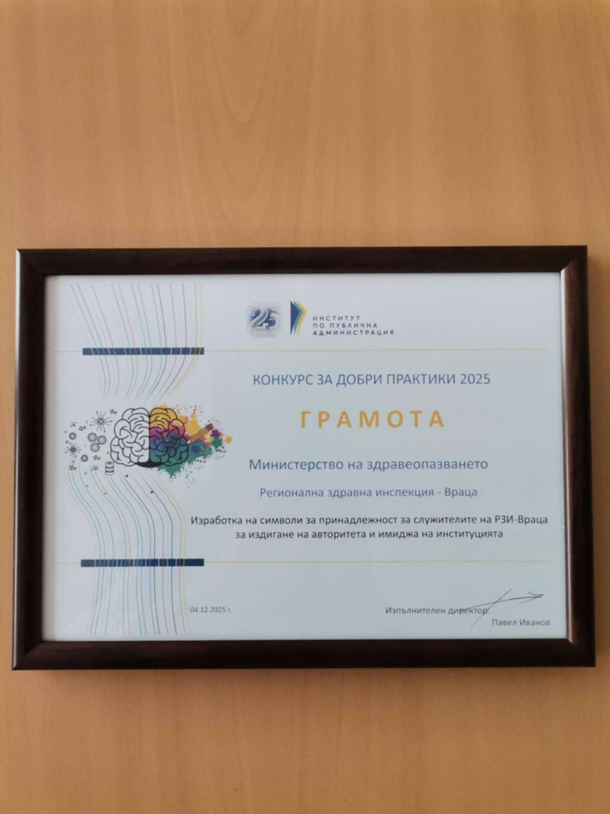 РЗИ-Враца беше удостоена и с грамота от националния конкурс за „Добри практики в дейността на администрацията в България“, организиран от Института по публична администрация. Отличието беше присъдено на здравната инспекция за изготвеното предложение, по повод реализирана добра практика - „Изработка на символи за принадлежност за служителите на РЗИ-Враца за издигане на авторитета и имиджа на институцията“. През 2025 г. бяха изработени символи за принадлежност – шалчета за служителките, значки, визитки и почетни грамоти за най-дългогодишните служители на инспекцията, за последващото им използване, с цел изграждането на по-силен и разпознаваем публичен образ на институцията, за утвърждаване на нейните ценности, укрепване на организационната и екипна култура и повишаване на гордостта на служителите.