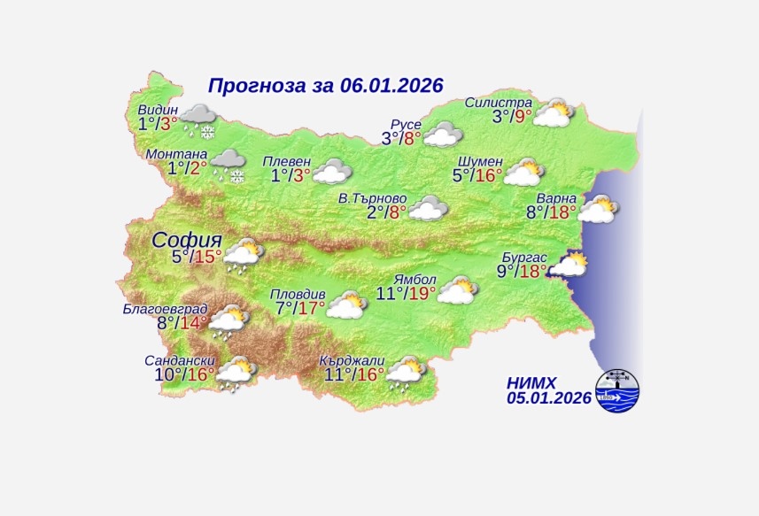 Днес облачността ще се задържи значителна. На места, главно в Дунавската равнина и Рило-Родопската област, ще има превалявания от дъжд. Вятърът в източната половина от страната и на север от планините ще е умерен и временно силен от юг-югозапад; температурите там ще се задържат високи, максималните – между 14° и 19°. В по-голямата част от Дунавската равнина ще духа слаб северозападен вятър и видимостта временно ще се подобри. Температурите там ще останат без съществен дневен ход, и максималните ще са между 2° и 7°. В София максималната температура ще бъде около 15°.