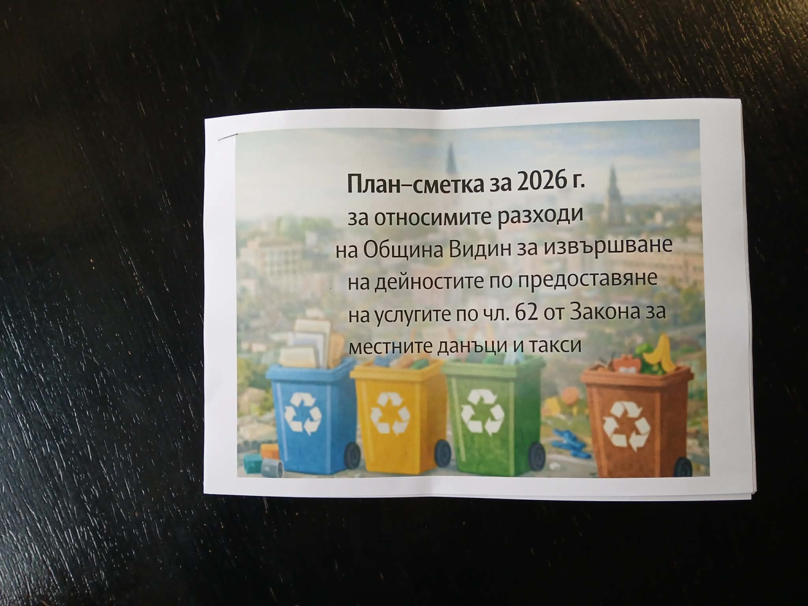 Община Видин изготви план–сметката за 2026 г. за относимите разходи по предоставяне на услугите по чл. 62 от Закона за местните данъци и такси (ЗМДТ) – събиране, транспортиране и третиране на битовите отпадъци, както и поддържане на чистотата на териториите за обществено ползване.
