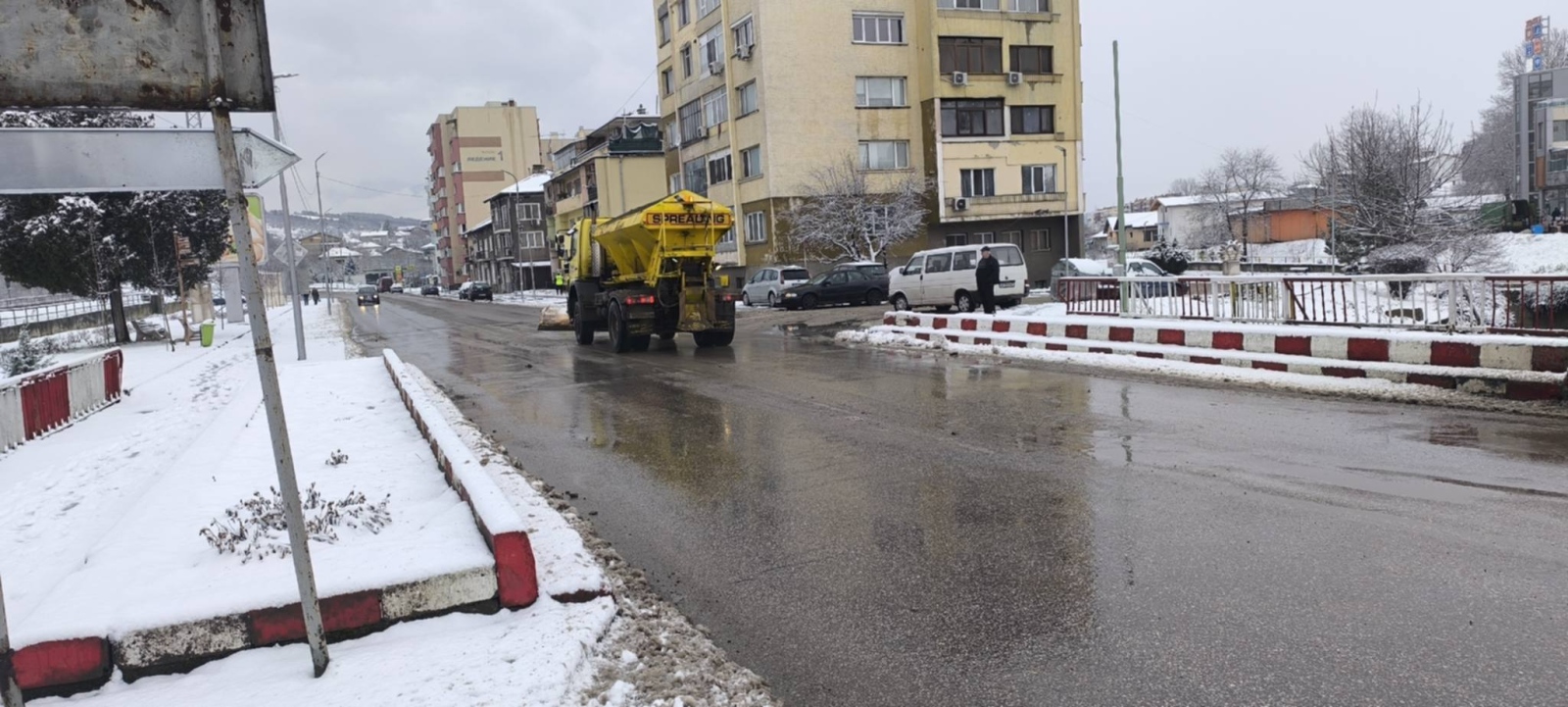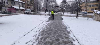 Служители на Общинско предприятие "Чистота" работят по снегопочистването и опесъчаването на градските улици и на пътищата от общинската пътна мрежа.