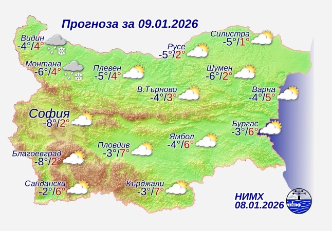 Днес ще бъде предимно слънчево. След обяд от запад-северозапад ще започне ново увеличение на облачността. Вятърът ще отслабне и в Източна България ще се ориентира от югозапад. Максималните температури ще бъдат от 0°-1° в Североизточна България до 7°-8° на места в Южна, в София – около 2°. През нощта срещу събота от северозапад ще започнат нови валежи - от дъжд и сняг. В Северозападна България ще има условия и за поледици.