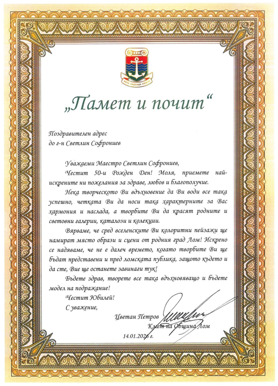 Община Лом почете с поздравителен адрес видния художник-акварелист от Лом Светлин Софрониев по повод неговия 50-годишен юбилей. Маестро Софрониев е един от най-добрите съвременни художници. Акварелите му се отличават със своя колорит и реализъм и се радват на изключителен интерес в страната и чужбина. Неговите творби намират място на страниците на специализирани световни издания и каталози.